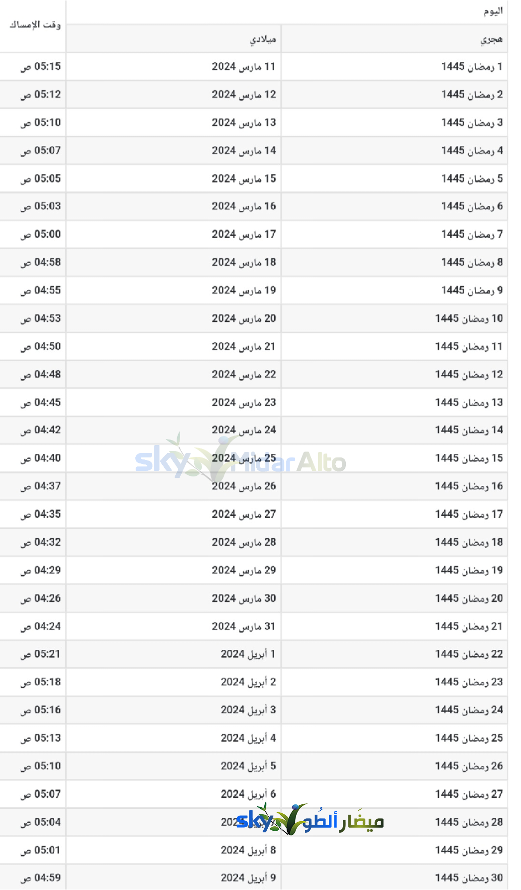 ملاحظة: شهر رمضان يبدأ على حسب رؤية الهلال، لكن من المتوقع أن أول أيامه المباركة سيكون يوم 11 مارس كما يظهر في الإمساكية بالأسفل، وأيضاً بالنسبة للوقت فقد يختلف من مدينة إلى أخرى، لذلك قم بالإمساك عن الطعام قبل هذا الوقت بقليل.
